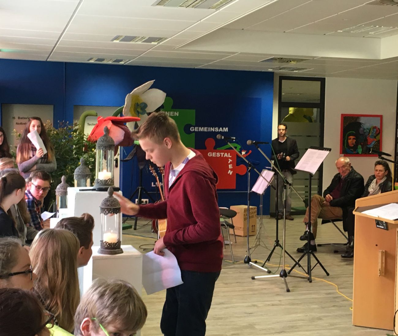 Zwei weitere Schüler berichteten eindrucksvoll in rumänischer und russischer Sprache, die von ihren Mitschülern synchron auf Deutsch übersetzt wurden, von den Flüchtlingserfahrungen ihrer Familien. Als Erinnerung an die Opfer der Familien Eichenwald, Hesse und Jacobus wurden von den Schülern Kerzen angezündet. Eine Gedenkminute wurde abgehalten.
