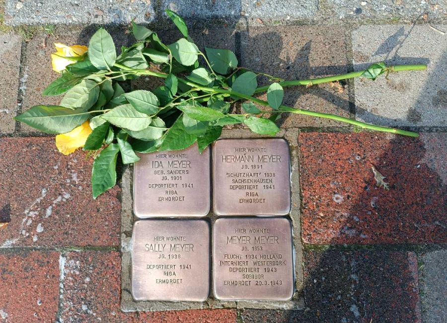 Landwirt Hermann Meyer starb in Riga mit 50 Jahren, ebenso starb dort Ida Meyer mit 40 Jahren und Sally Meyer wurde in Riga nur 3 Jahre alt. Vier Stolpersteine wurden ihrer zum Gedenken am 14. Juni 2017 verlegt.