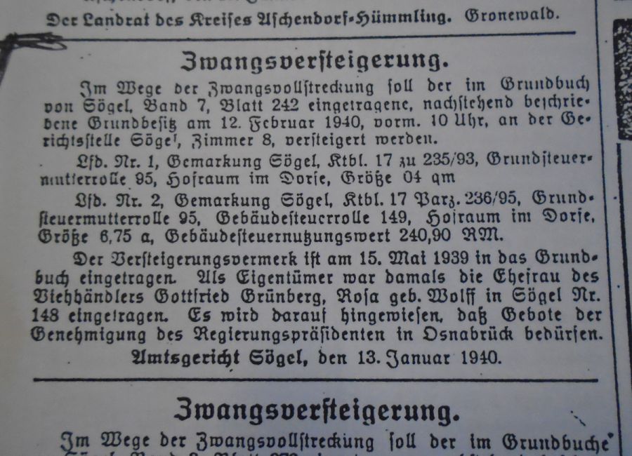 Zwangversteigerung des Grundbesitzes der Grünberg-Familie