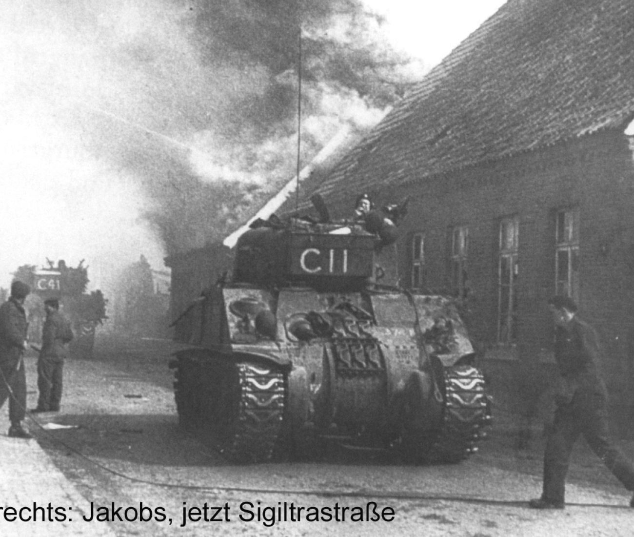 Das Haus der Jacobs, stand am 9. und 10. April 1945 im Mittelpunkt der schweren Kämpfe, die im Sögeler Nordend stattfanden als kanadische Soldaten mit ihren Panzern Sögel besetzten. Den in den KZ’s getöteten Mitgliedern der Familien Jacobs zum Gedenken, wurden am 30. April 2015 sieben Stolpersteine verlegt.