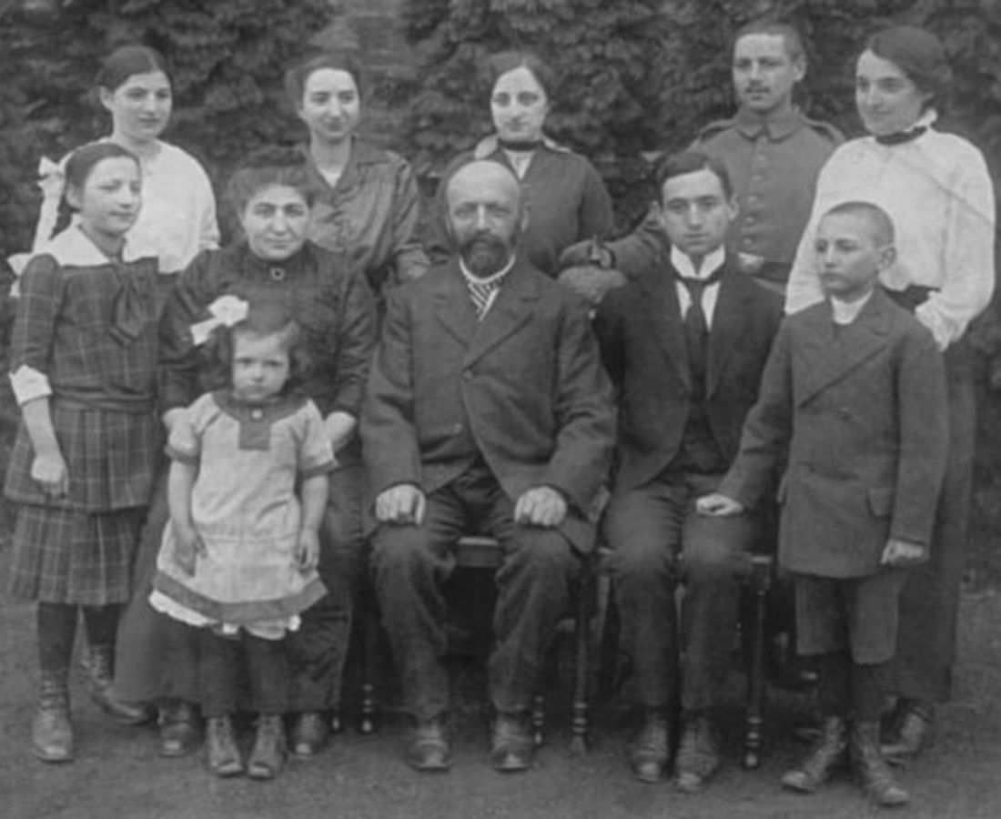 Erik-Meyer Jacobs‘ Familie im sauerländ. Nuttlar 1916 – von o. l.: Frieda, Bertha, Adele, David und Rosa. Vordere Reihe von links: Hilde, Emma geb. Weinberg, davor Erika, Meyer Jakobs, Alfred und Erich.