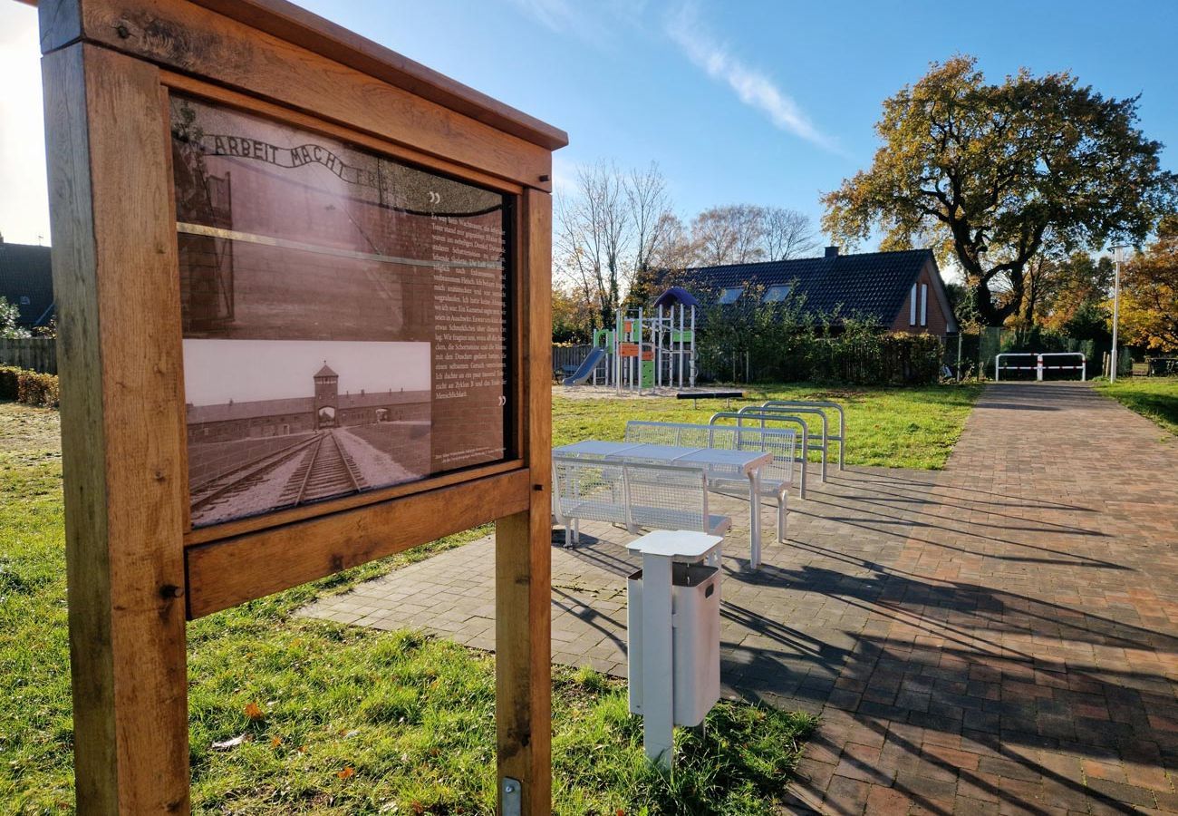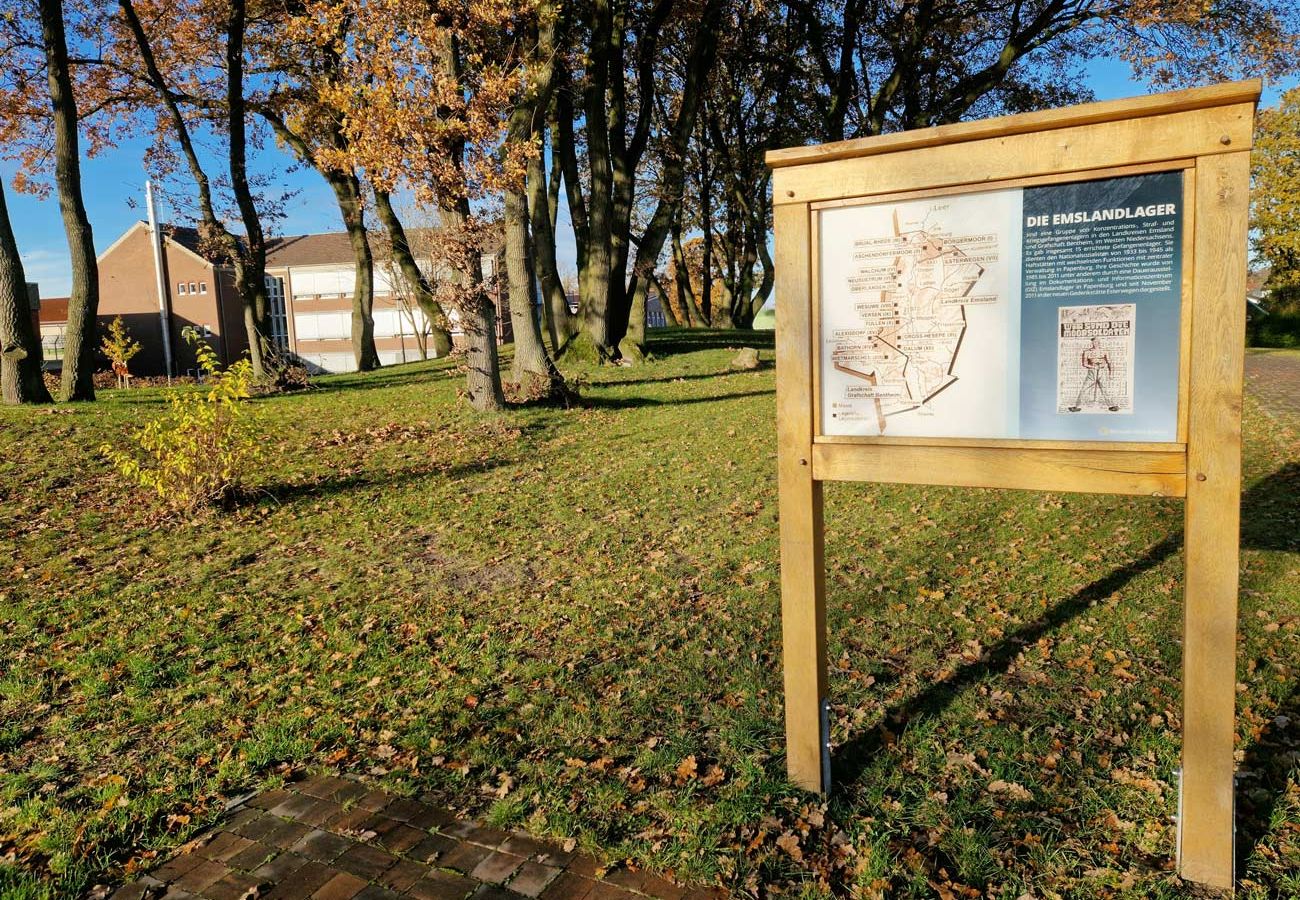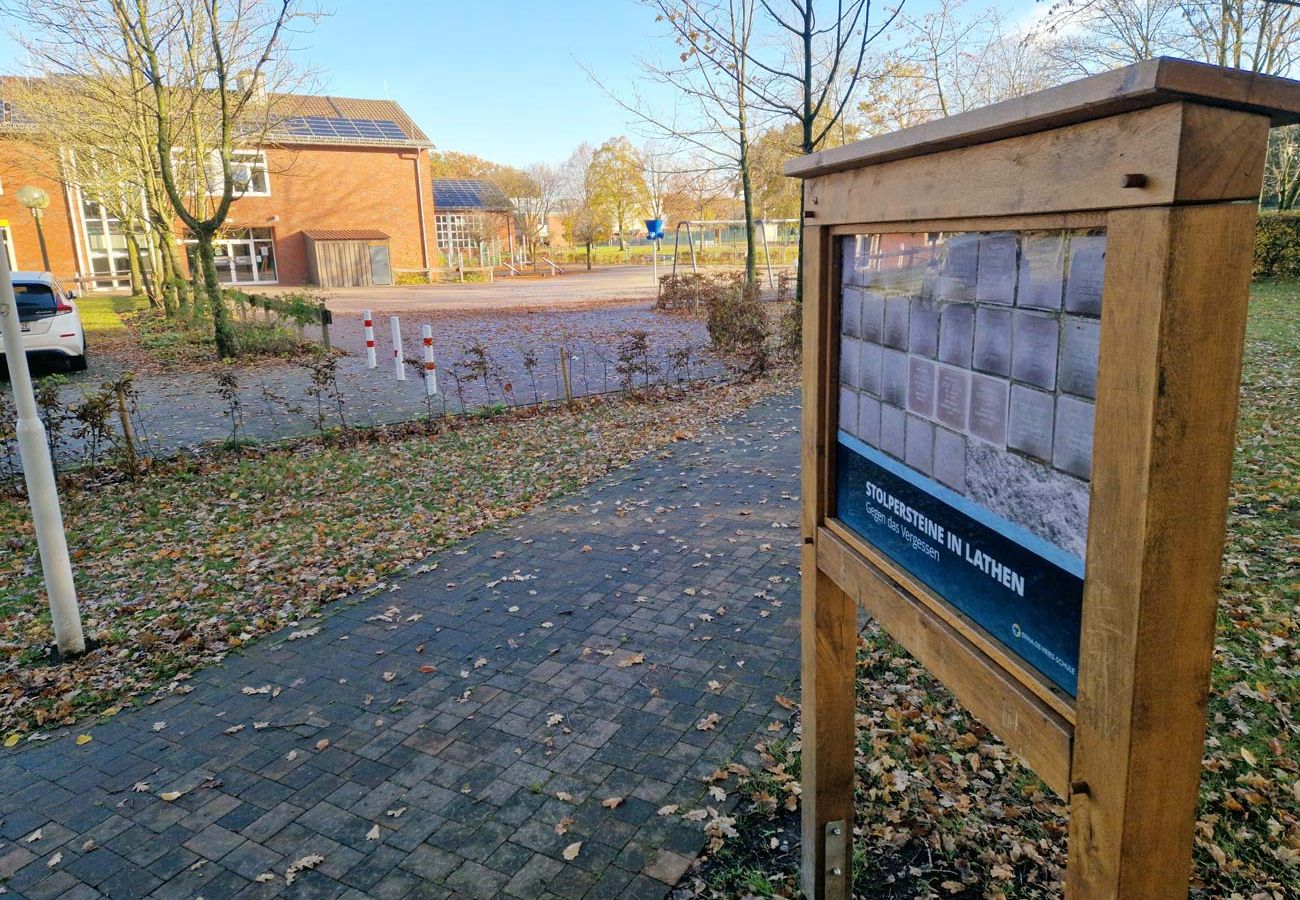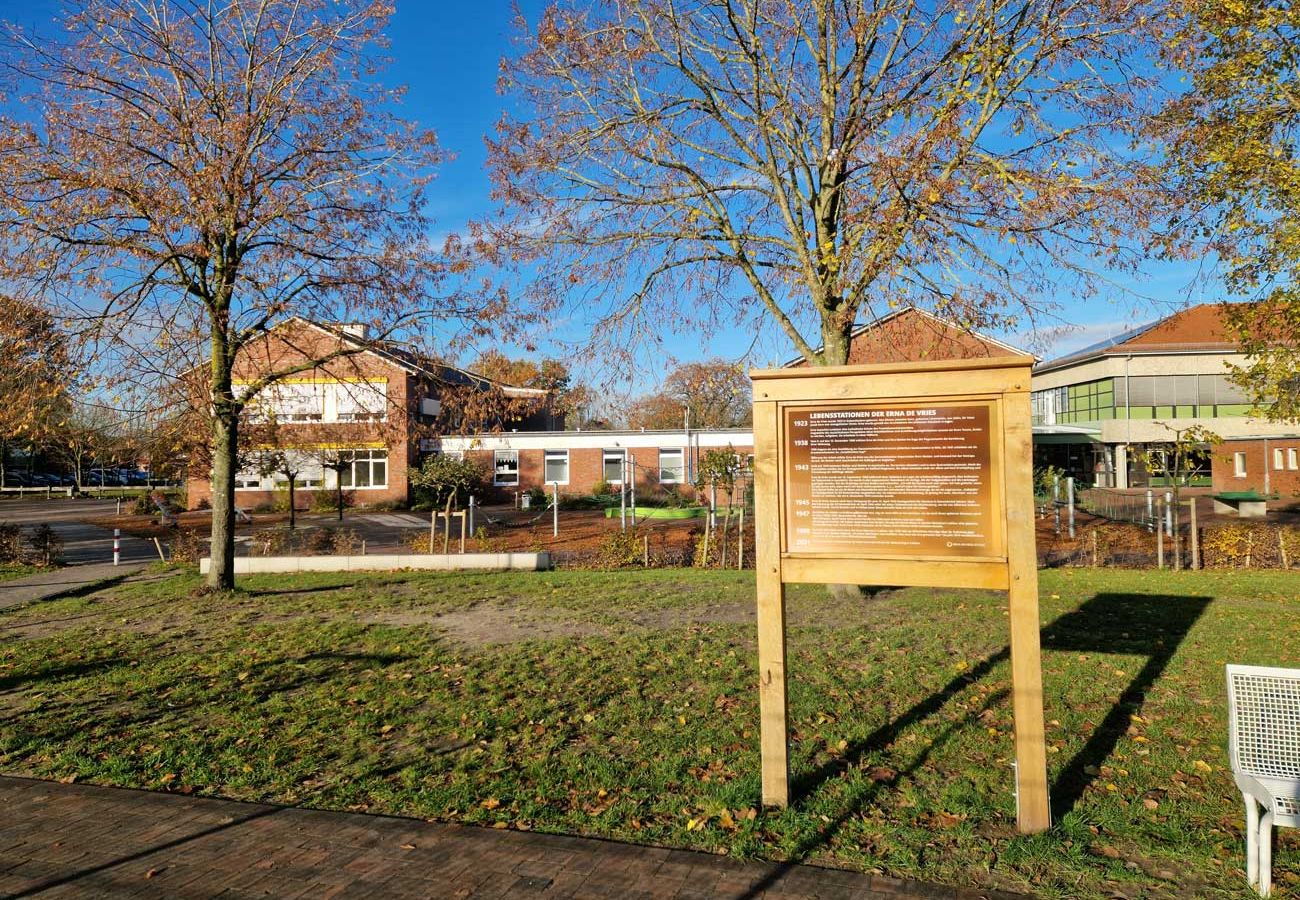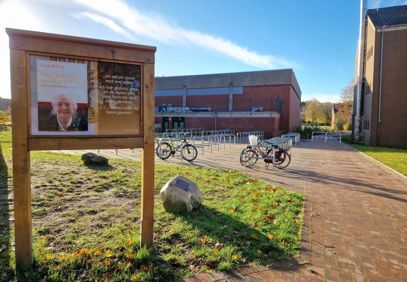 Neben der Ausgestaltung der Eingänge der Schule wurden auf dem Rad- und Gehweg entlang des Schulgeländes Informationstafeln aufgestellt, die neben dem Leben und Wirken von Erna de Vries auch auf die Emslandlager oder anhand der Stolpersteine auf die jüdischen Familien in Lathen aufmerksam machen.